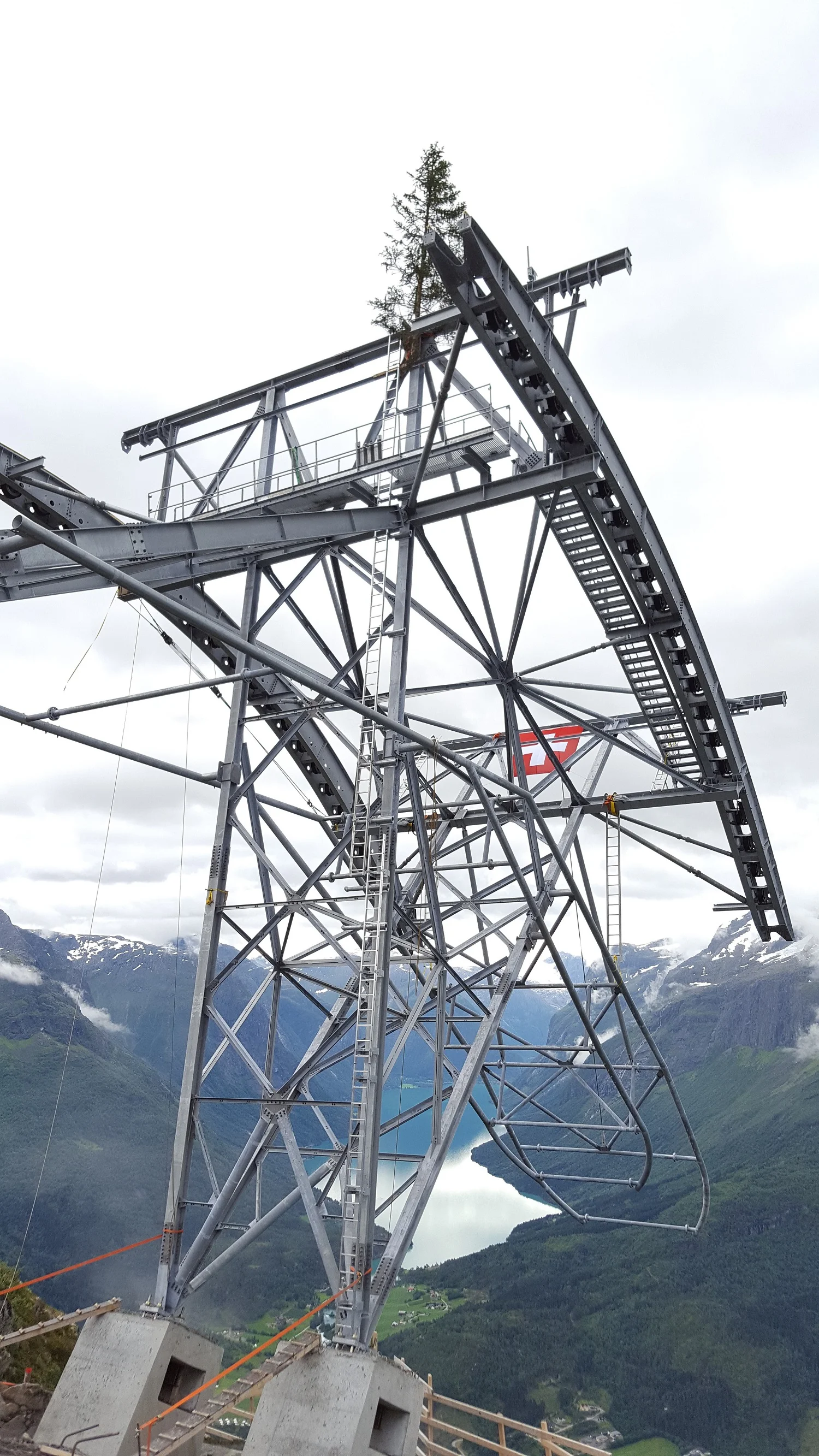 Ein viktig milepæl for Hoven Loen prosjektet denne veka, med ferdigstilling av toppmasta. Arbeidet er utført av Garaventa sitt sveitsiske team, med god assistanse frå Førde Kranutleige. Garaventa har installert slike baner over heile verda, men ingen så bratte som denne, og montørane har verkeleg fått lufta seg med 1000 meter under føtene.