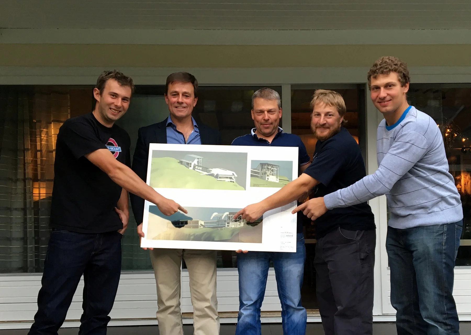 Ein nøgd gjeng frå Garaventa sitt Sweitzerteam saman med dagleg leiar i Hoven Loen. Frå venstre: Lucas, Richard, Daniel, Lucas og Jonas.